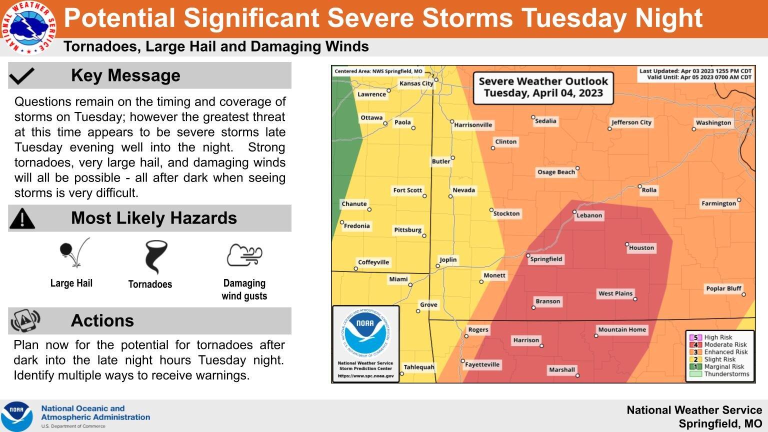 Neighbors, as you may have likely heard, there is a moderate risk (4 out of 5) for strong tornadoes, damaging winds, and dangerous nighttime tornadoes tomorrow, Tuesday, April 4th, into Wednesday morning, April 5th, for southern portions of the state. For the latest updates, see https://www.spc.noaa.gov/ 𝐓𝐇𝐄 𝐌𝐎𝐒𝐓 𝐈𝐌𝐏𝐎𝐑𝐓𝐀𝐍𝐓 𝐓𝐇𝐈𝐍𝐆𝐒 𝐓𝐎 𝐃𝐎 𝐍𝐎𝐖 𝐓𝐎 𝐏𝐑𝐄𝐏𝐀𝐑𝐄 1) 🧑🚒 Find trusted information from local public agencies 2) 📱 Have multiple ways (mobile phone, TV, radio, FEMA app) to receive weather alerts and to keep your phone charged. 3) 🌪️ Identify where you can take shelter if a tornado warning is issued. The safest place in a home is the basement. If there is no basement, an inside room, without windows, on the lowest floor is second best. If you live in a mobile home and need shelter, you can explore maps like this one http://findyourtornadoshelter.com. Be sure to have a plan for how you will get there. Remember, if a tornado warning is issued, the tornado is here or near, and you need to take shelter immediately! It's also helpful to: 🌬️ Secure or bring in items that could become projectiles 📷 Take pictures of your home before the storm; this can help with insurance later if needed 🙋 Make sure your neighbors have a plan and transportation to shelters, if needed 𝐓𝐇𝐑𝐄𝐄 𝐈𝐌𝐏𝐎𝐑𝐓𝐀𝐍𝐓 𝐓𝐇𝐈𝐍𝐆𝐒 𝐓𝐎 𝐃𝐎 𝐖𝐇𝐄𝐍 𝐓𝐇𝐄 𝐏𝐎𝐖𝐄𝐑 𝐈𝐒 𝐎𝐔𝐓 ✅ Keep freezers and fridges closed as much as possible ✅ Switch off electronics to avoid damage from surges ✅ Place generators outside, at least 20 ft. away from the house Follow these food safety tips: 🤢 Don't taste the food 🌡️ Use a thermometer to check food temperature 🗑️ Throw away food that is 40+ degrees Fahrenheit for more than 2 hours 𝐂𝐎𝐏𝐈𝐍𝐆 𝐖𝐈𝐓𝐇 𝐒𝐓𝐑𝐄𝐒𝐒: 😔 It's common to feel overwhelmed, anxious, isolated, or distressed during such events. 🫶 You're not alone: The National Disaster Distress Line 1-800-985-5990 offers 24/7 confidential, multilingual emotional support https://www.samhsa.gov/find-help/disaster-distress-helpline